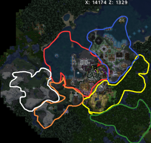 从权力权重上排序为中央(红)、淡海(蓝)、弘农(黄)、群峦(橙)、西凉(白)、大野(绿)。<br>