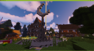 天守阁虽然是东岛上第四个建筑物,但是直到现在也尚未完工,并且中间有好长一段时间(至少持续俩月)是未封顶的状态,由于笔者野心过大,一个东西做着做着无聊了,就立马想去做别的,一边忙着新神社一边忙着天守阁,又和yugiri一起改造地形收集材料,援助疯狗的德意志大会堂(反动建筑,戏称),无论做什么都会三心二意的笔者用了巨久的时间也没有彻底完成这个建筑,但是会完成的,(在寒蝉鸣泣之时