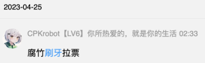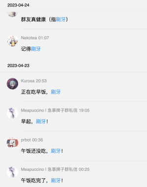 MJJJJJJJ在三个群同时发了一张高速刷牙的GIF,与此同时HAIDANREN(海水淡化成本巨大) 也同时在三个群回复“刷牙没有必要让几千人知道”