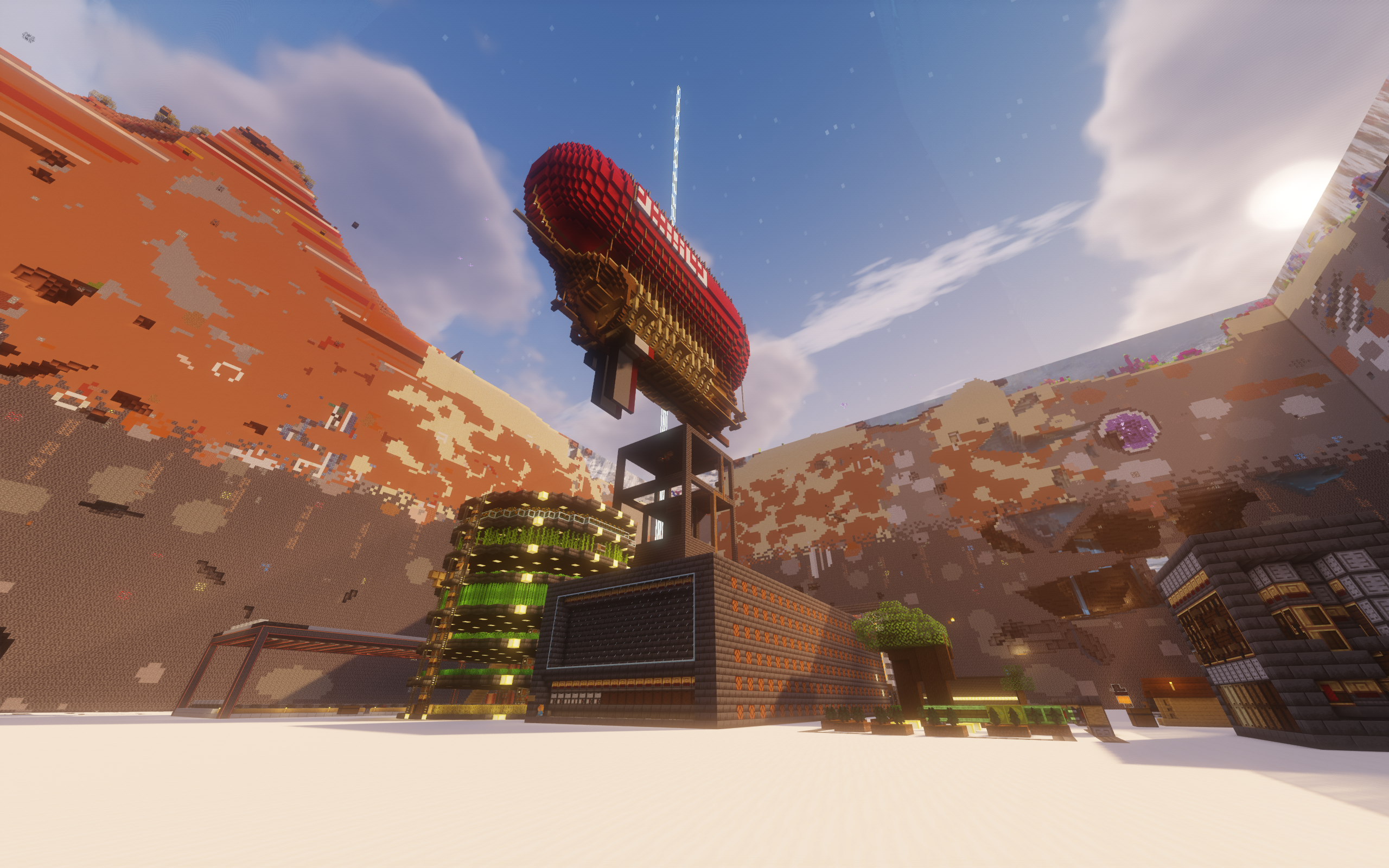 地面设施按从左到右的顺序,分别为附魔室集群、农业塔、石精灵农场、60笼刷怪塔、旋转树场、挂机小屋和木工站