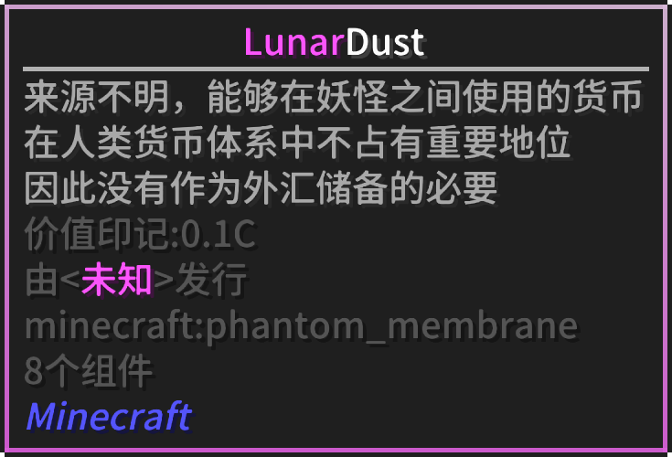 当前2025年7月8日 (二) 18:222025年7月8日 (二) 18:22版本的缩略图735 × 500​(137 KB)秋月白留言 | 贡献代币LunarDust的tooltip。 使用[https://www.mcmod.cn/class/4504.html Isometric Renders模组]导出,字体为[https://www.mcmod.cn/class/2454.html Modern UI模组]的自带字体。 Category:代币